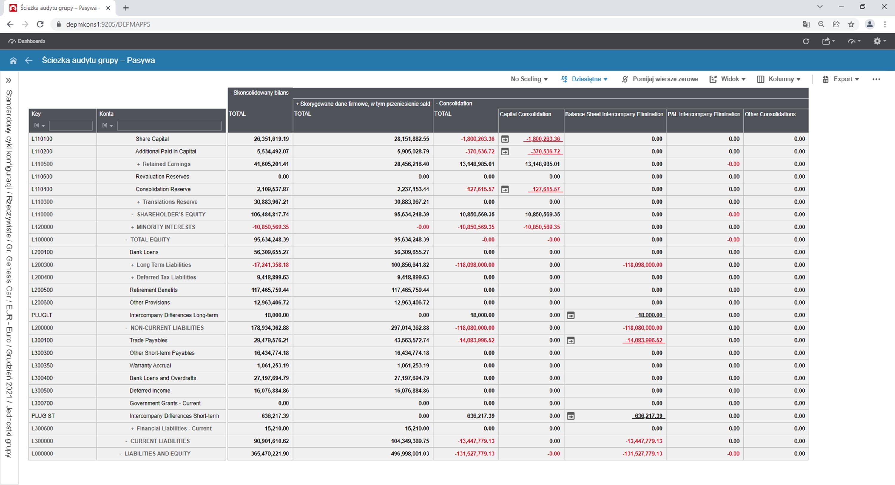 Rys. 10. Audyt Konsolidacji – Zobowiązania. Źródło: Opracowanie własne na podstawie Infor d/EPM Financial Consolidation.