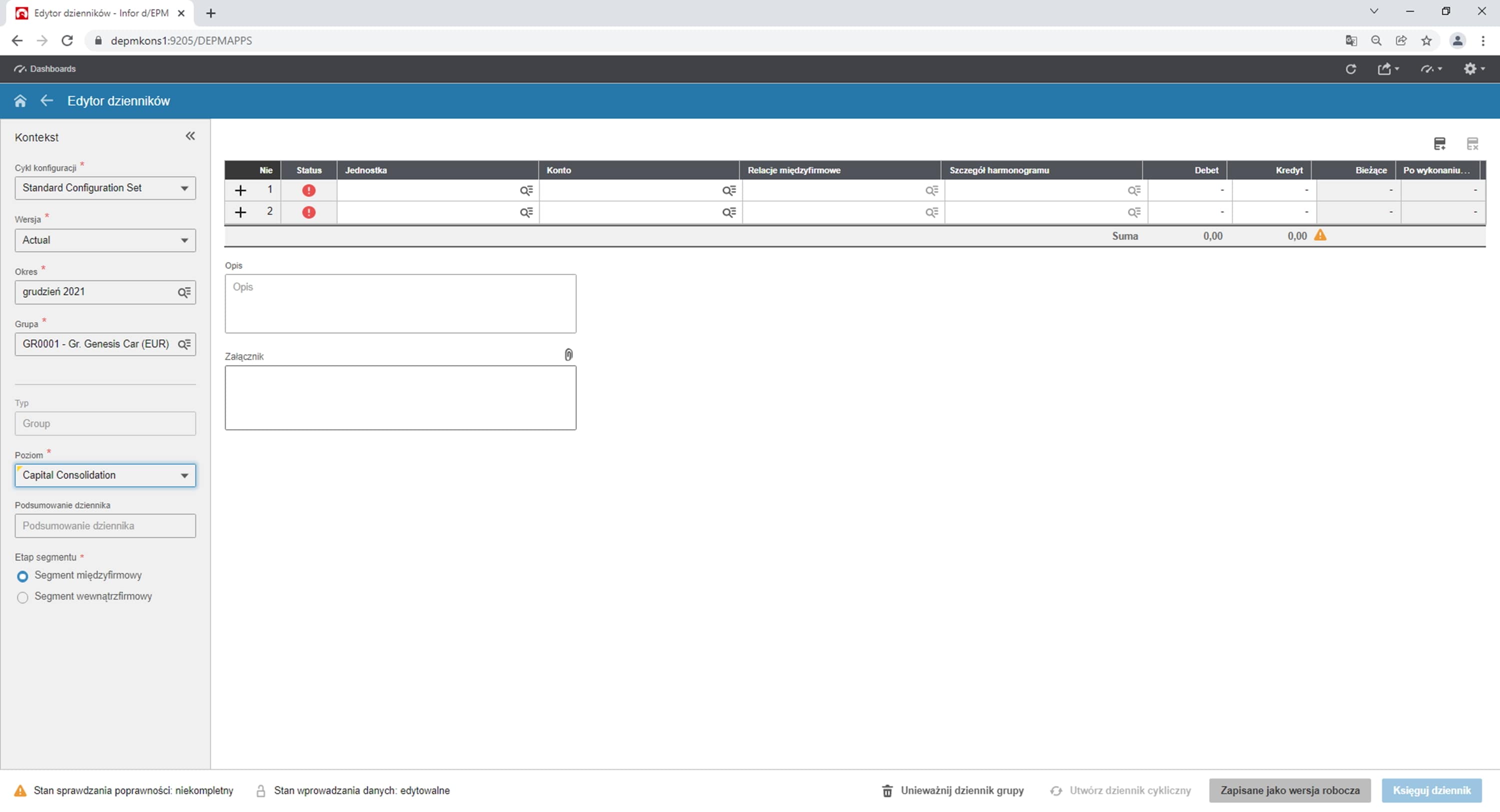 Rys. 11. Dziennik grupowy. Źródło: Opracowanie własne na podstawie Infor d/EPM Financial Consolidation.