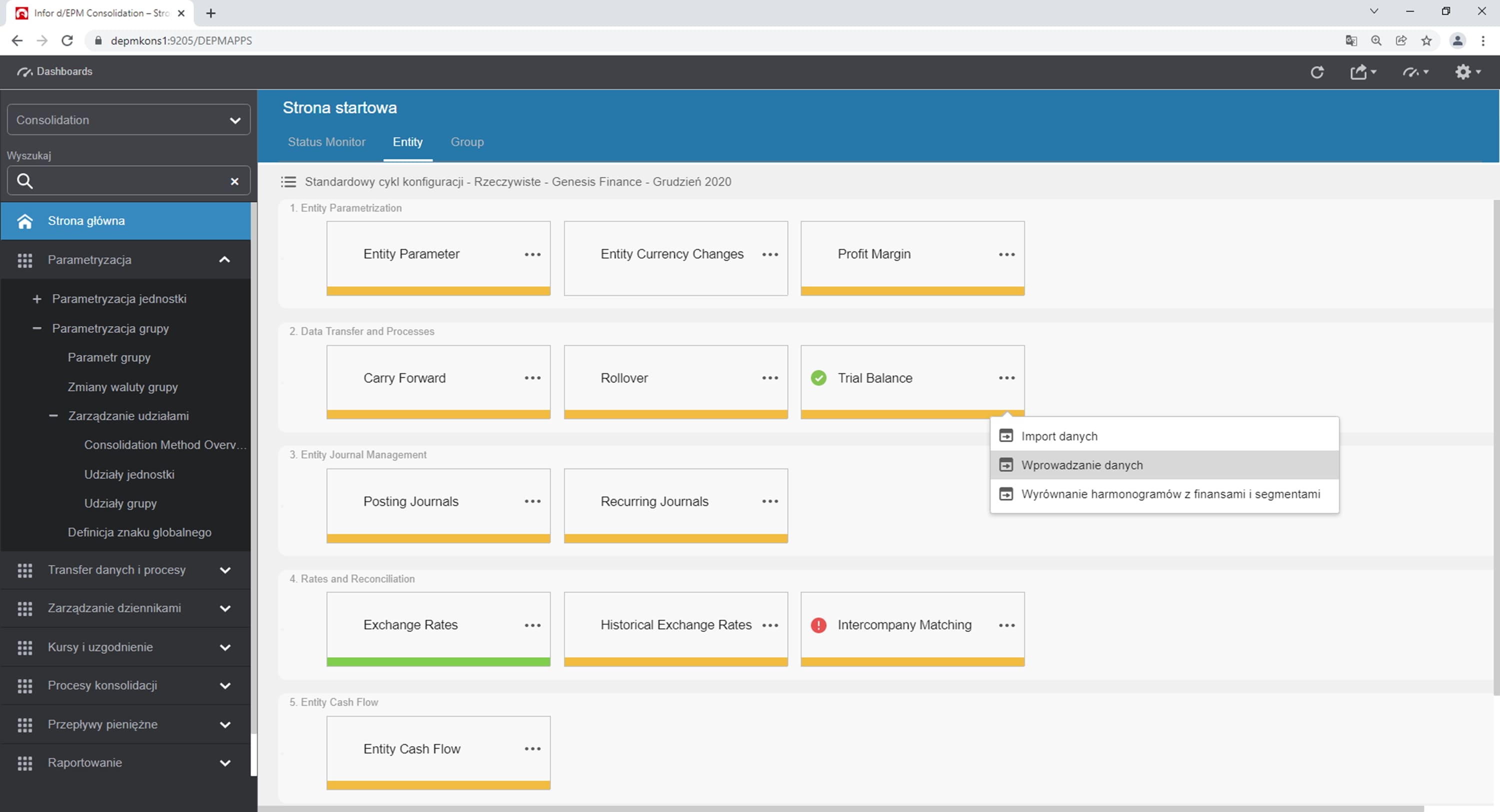 W pierwszej kolejności należy uruchomić proces pracy z pakietami jednostkowymi spółek (Rys. 3) – w przykładzie będziemy zajmować się spółka Genesis Finance, której należy włączyć możliwość importu danych przestawiając status na „W toku”. To samo należy zrobić dla drugiego poziomu wprowadzania danych, czyli ręcznego wprowadzania danych, które nie pochodzą z plików i interfejsu i którego etapu możemy używać do uzgadniania transakcji międzyzakładowych. Widoczne na Rys. 3. Kontrolki walidacyjne pozwalają na badanie zgodności aktywów z pasywami – jeżeli coś nie będzie zbilansowane w ramach spółki, będzie od razu widoczne, że w ramach danego etapu takie zbilansowanie nie występuje.