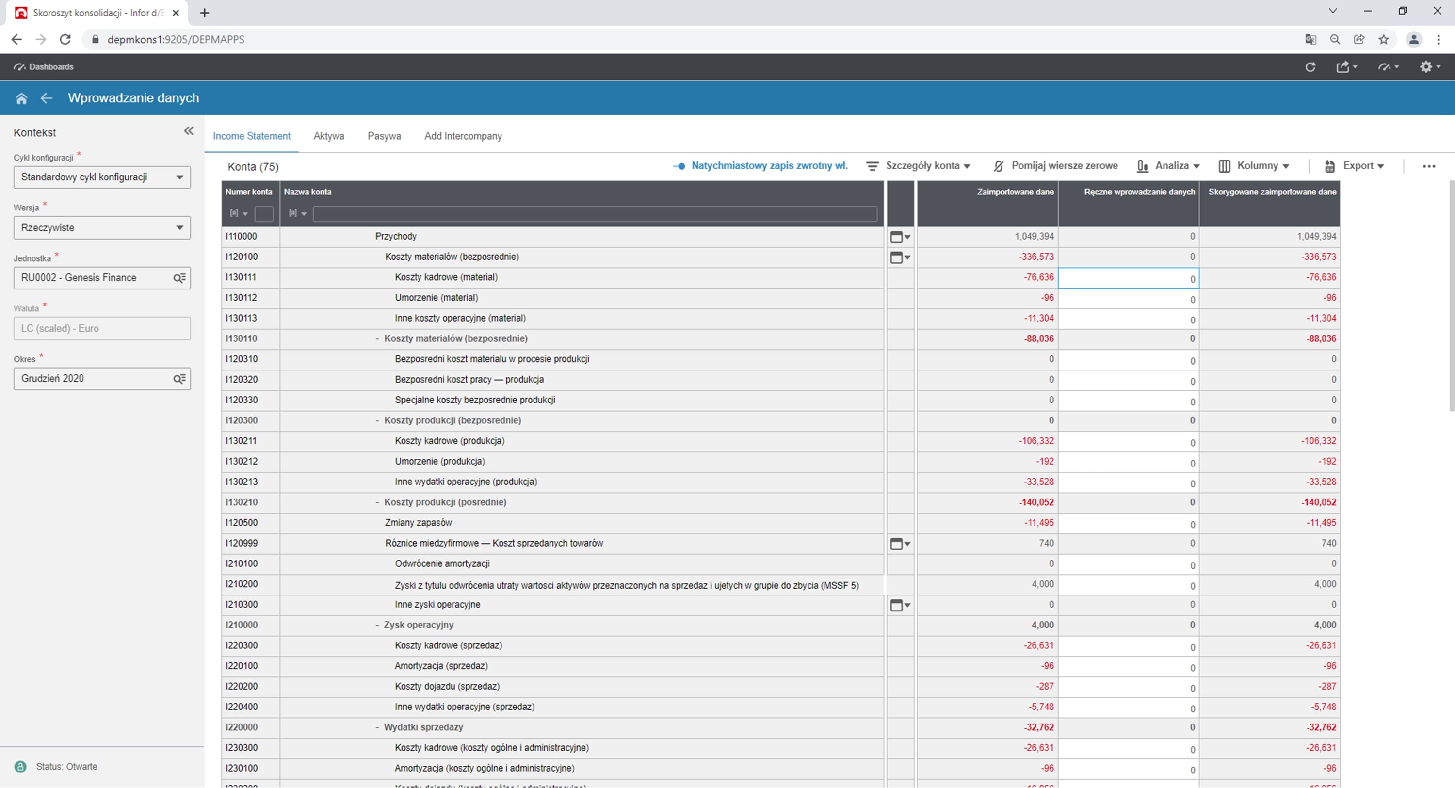 Rys. 4. Wprowadzanie danych – Rachunek wyników. Źródło: Opracowanie własne na podstawie Infor d/EPM Financial Consolidation.