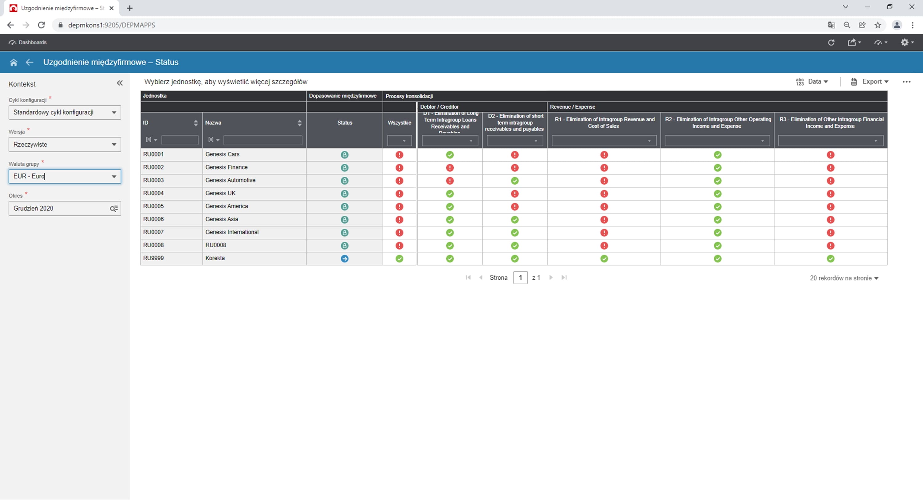 Dane można również oglądać w sekcji raportów jednostkowych (Rys. 6). Raporty te również mogą podlegać rozbudowie według indywidualnych wymagań. Ponieważ jesteśmy grupą wielowalutową, można zobaczyć transakcje przeliczone na walutę grupy, co jest bardzo cenną dla nas informacją, bo pozwala identyfikować ewentualne dalsze niezgodności.