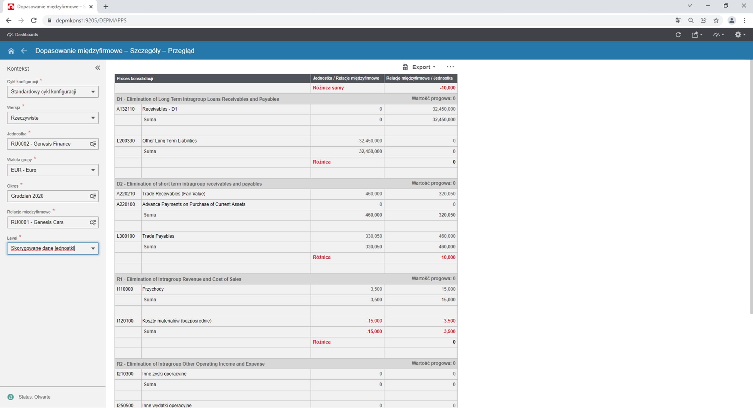 Rys. 5. Sprawdzanie uzgodnień sald międzyzakładowych. Źródło: Opracowanie własne na podstawie Infor d/EPM Financial Consolidation.
