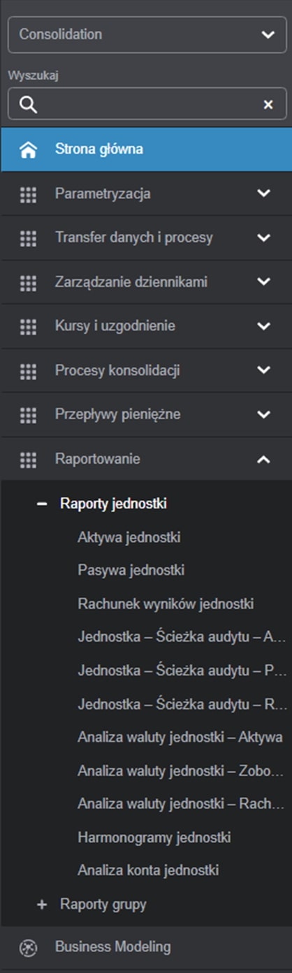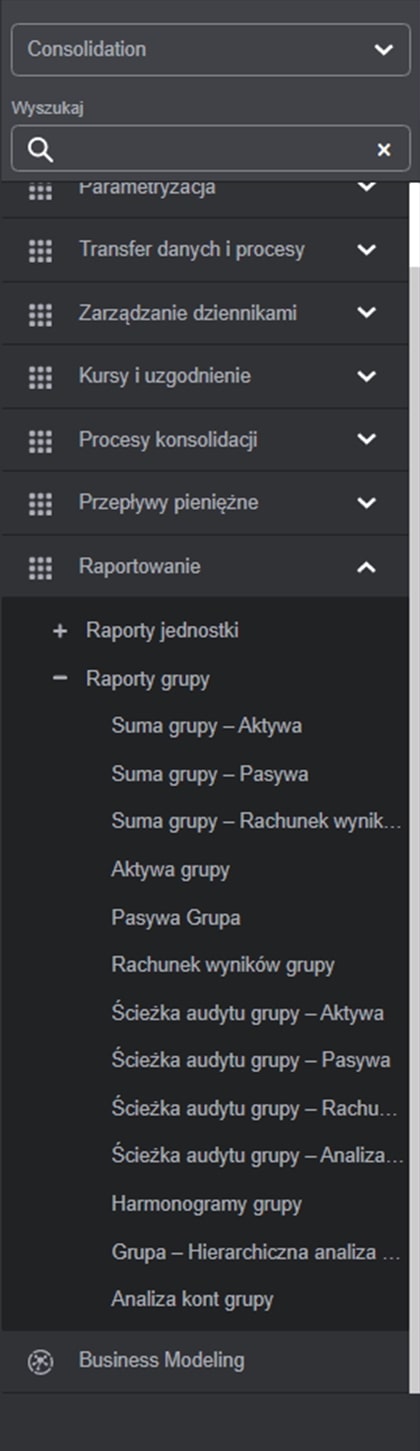 Rys. 6. Dostępne raporty jednostkowe. Źródło: Opracowanie własne na podstawie Infor d/EPM Financial Consolidation.
