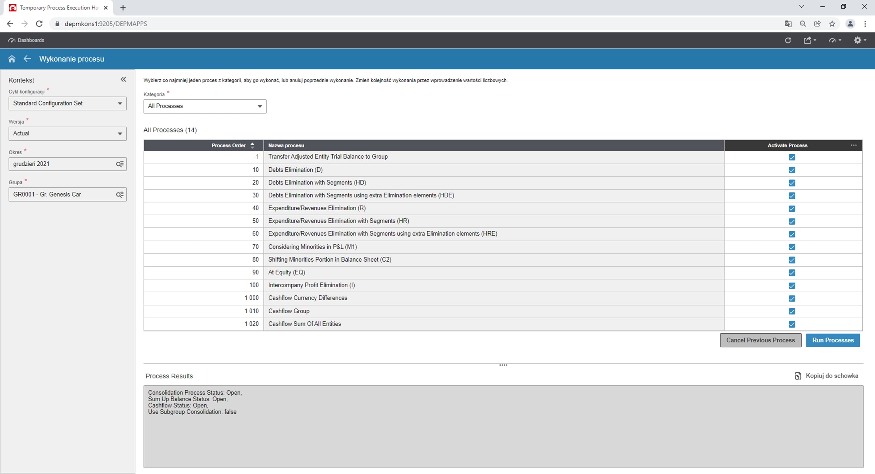 Rys. 3. Uruchomienie procesu do konsolidacji. Źródło: Opracowanie własne na podstawie Infor d/EPM Financial Consolidation.