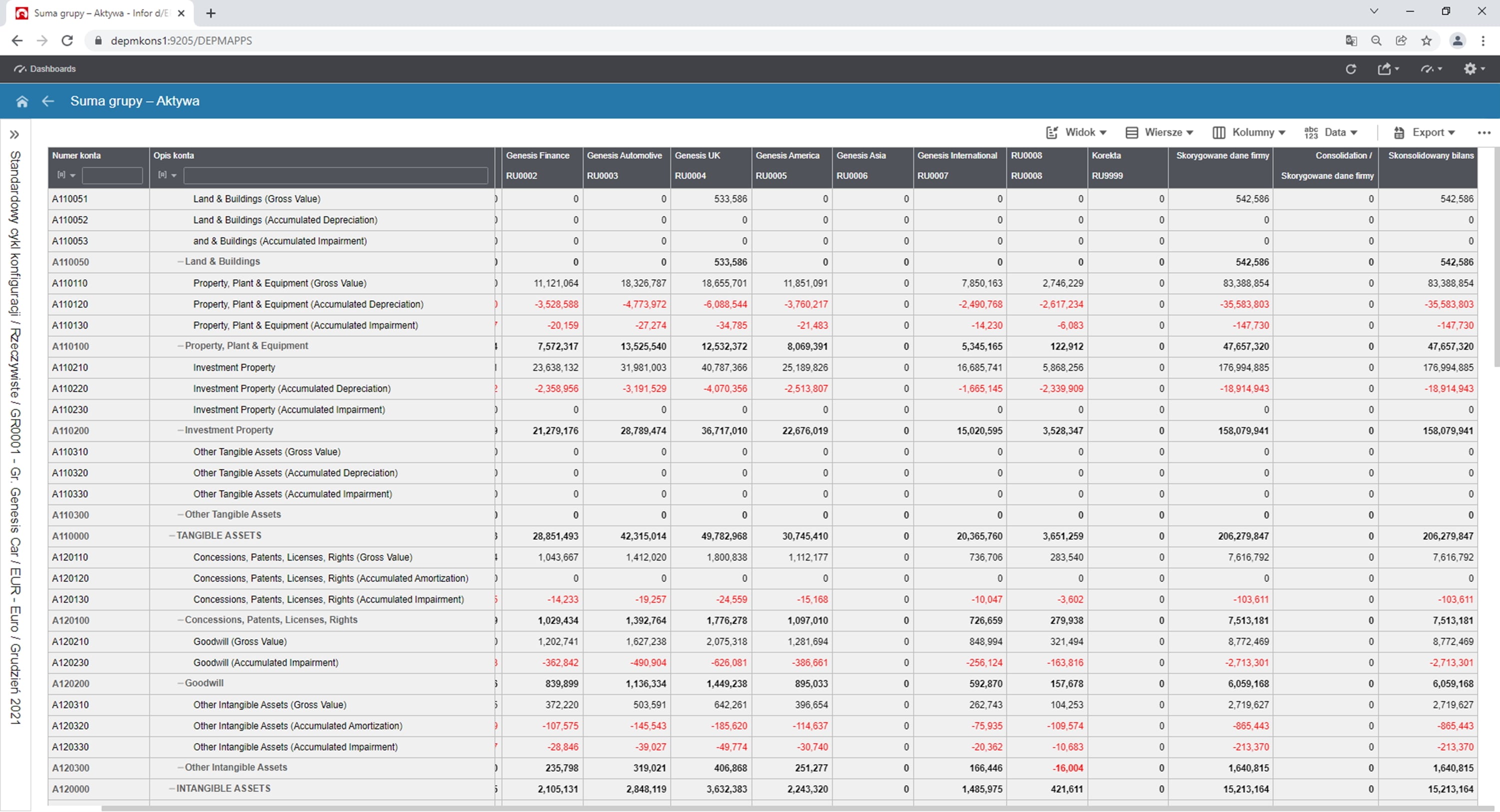 Rys. 9. Rachunek wyników grupy, który pokazuje, jaki był wkład spółek do konsolidacji. Źródło: Opracowanie własne na podstawie Infor d/EPM Financial Consolidation.
