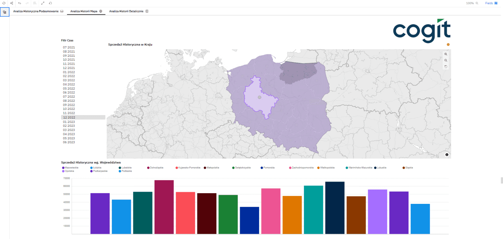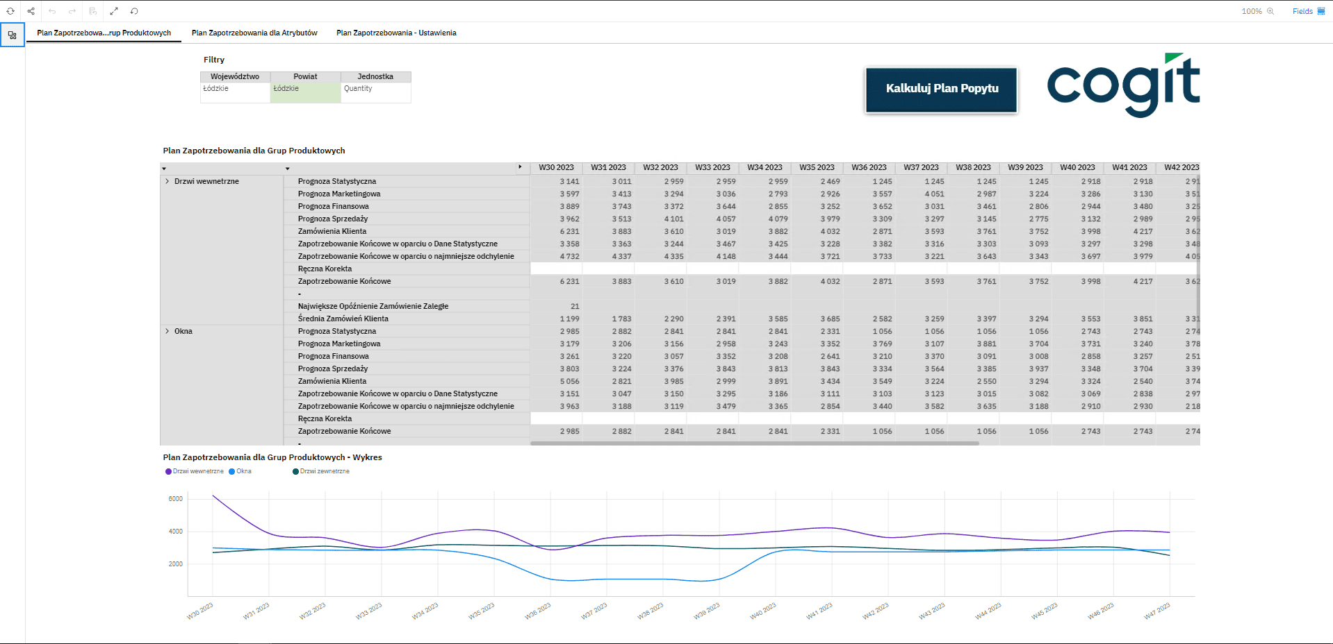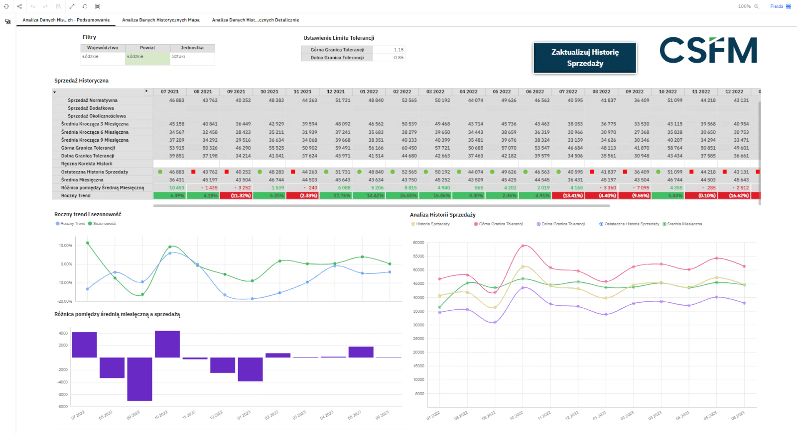 - Analiza danych historycznych – jest to pierwszy etap planowania zapotrzebowania w przedsiębiorstwie, tu przechowujemy wszystkie informację na temat sprzedaży historycznej wraz z prostymi algorytmami statystycznymi, dzięki, którym jesteśmy w stanie określić trend, średnią kroczącą oraz granice tolerancji sprzedaży dla różnych produktów na różnych rynkach.