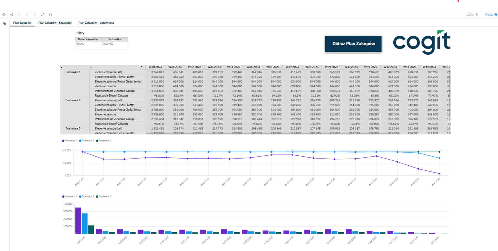 Umożliwia skuteczne zarządzanie procesem zakupowym, efektywne planowanie i monitorowanie zamówień zakupowych. Wartości związane z zleceniami zakupu są generowanymi przez stworzony algorytm lub pobierane z systemu ERP. Moduł umożliwia prognozowanie przyszłych zakupów dla każdego dostawcy, z uwzględnieniem warunków kontraktowych. Dane te są zbierane i analizowane, umożliwiając efektywne zarządzanie dostawami. System generuje plan zakupowy dla każdego dostawcy oraz dla wszystkich pozycji zakupowych, szczegółowe widoki z podziałem na dostawce i produkt, dzięki któremu jesteśmy w stanie dokładnie zobaczyć ilość pozycji zakupowych potrzebnych do realizacji zapotrzebowania oraz planu zakupowego dla produktu oraz dostawcy z uwzględnieniem wielkości palety oraz ilości sztuk wchodzących do palety, czy liczbę palet mieszczących się w ciężarówce.