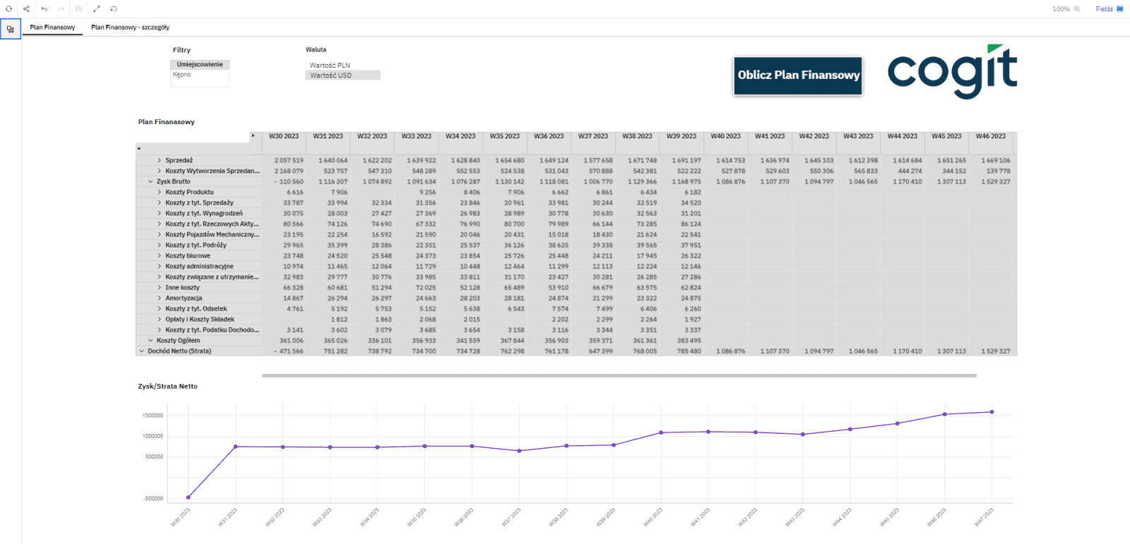 Przedstawia obecną oraz prognozowaną sytuację finansową przedsiębiorstwa. Moduł wykorzystuje informacje na temat zapotrzebowania oraz produkcji ujęte w module zarządzania zapasami. System generuje plan finansowy w ujęciu ogólnym oraz liniowo przedstawiony jest Zysk/Strata Netto, jak również szczegółowo rozpisany jest plan finansowy, w którym zawarte są wszystkie subkonta przedsiębiorstwa.