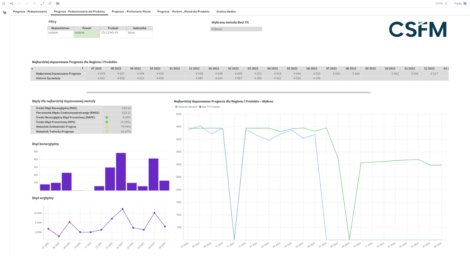 - Prognozowanie – jest to drugi etap w procesie planowania zapotrzebowania, w tym etapie mamy do czynienia ze statystycznym podejściem do prognozy. Dane historyczne są przesyłane do Pythona, gdzie obliczana zostaje prognoza z wykorzystaniem 7 metod, takich jak: Meta Prophet, ARIMA, Regresja Liniowa, Las Losowy (Random Forrest), Drzewa Decyzyjne (Decision Tree), SVR, XGBoost. Po obliczeniu prognozy, następuje wybranie najbardziej dopasowanej prognozy w oparciu o minimalizację błędu.